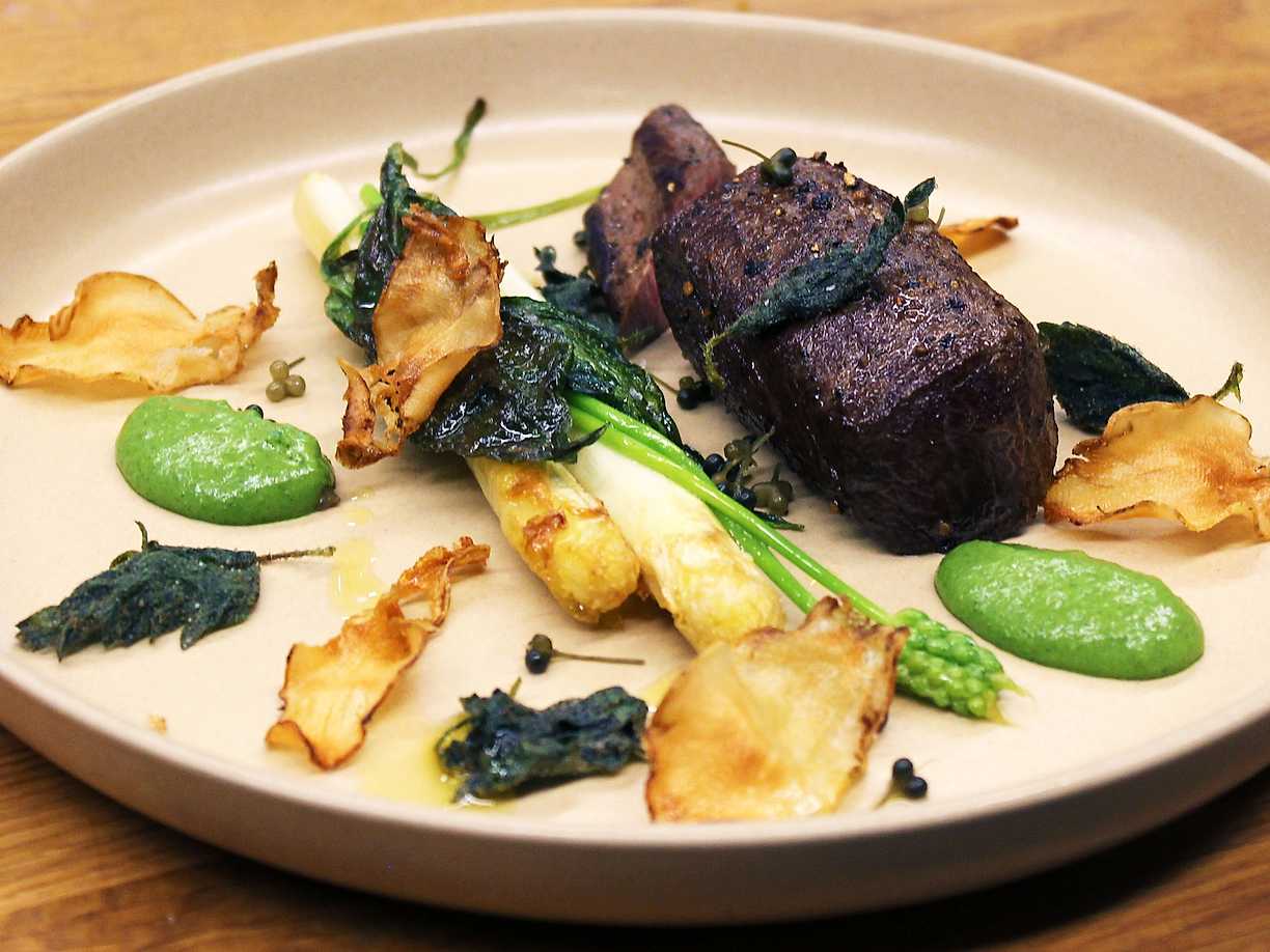Rådjur med rostad vit sparris, nässelkräm, jordärtskockschips och ramslökskapris