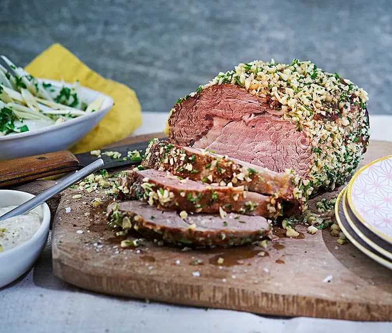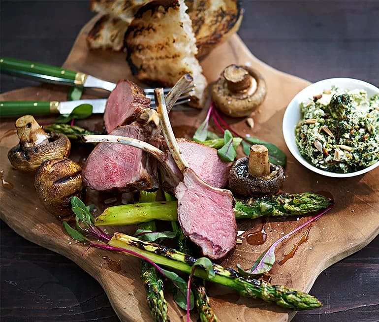 Grillad lammrygg med sparris i öländsk pesto, grillad aubergine och rostad vitlök