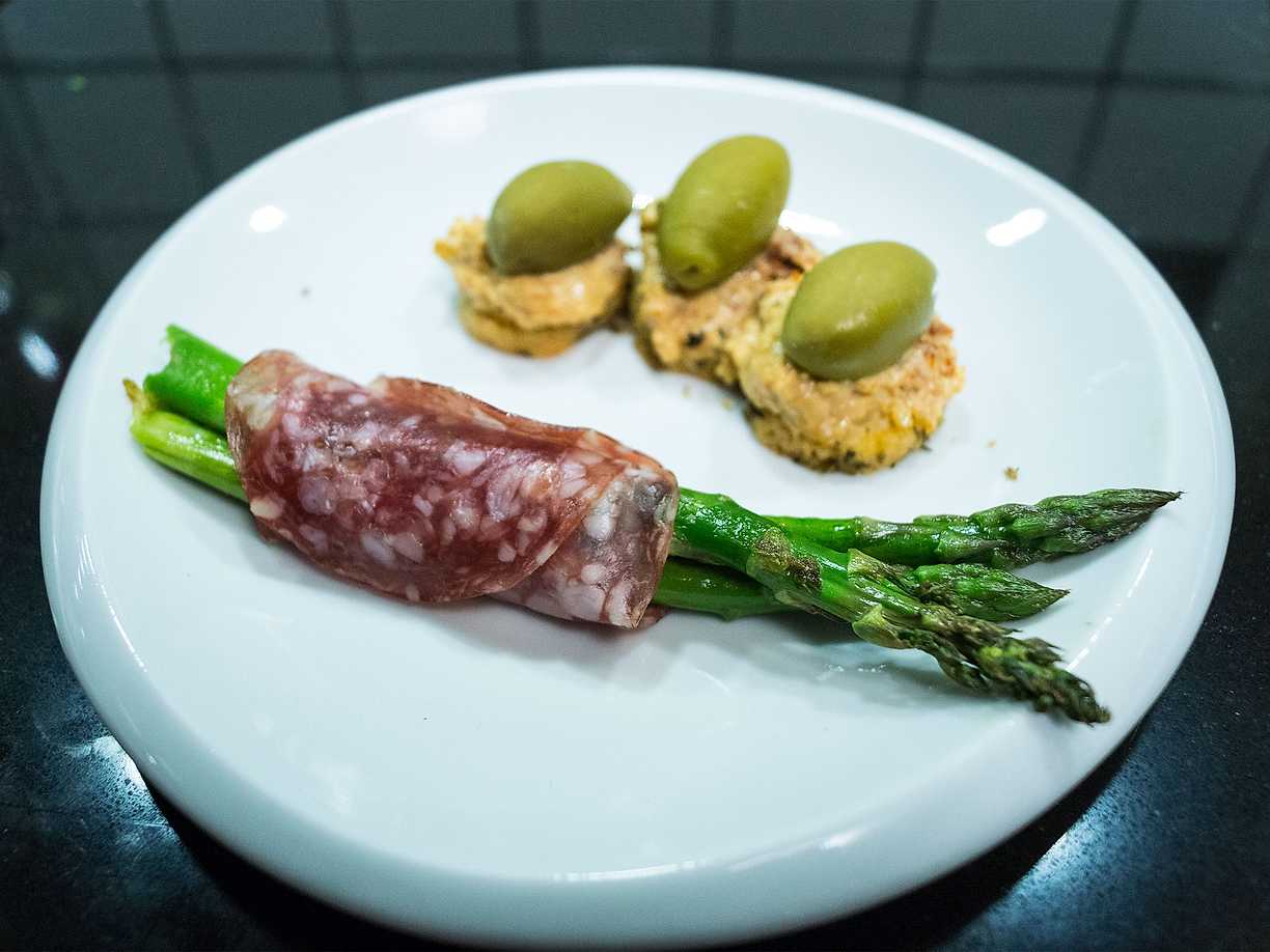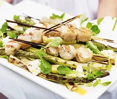 Pilgrimsmusslor med grön sparris och reducerad balsamico