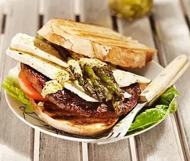 Cheeseburgare med brie, pestokräm och grillad sparris