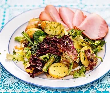 Kassler med färskpotatissallad med sparris och senapsdressing