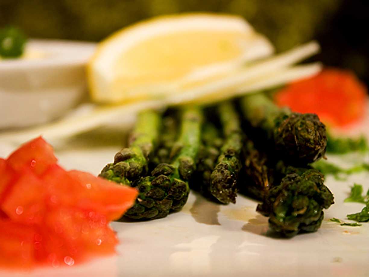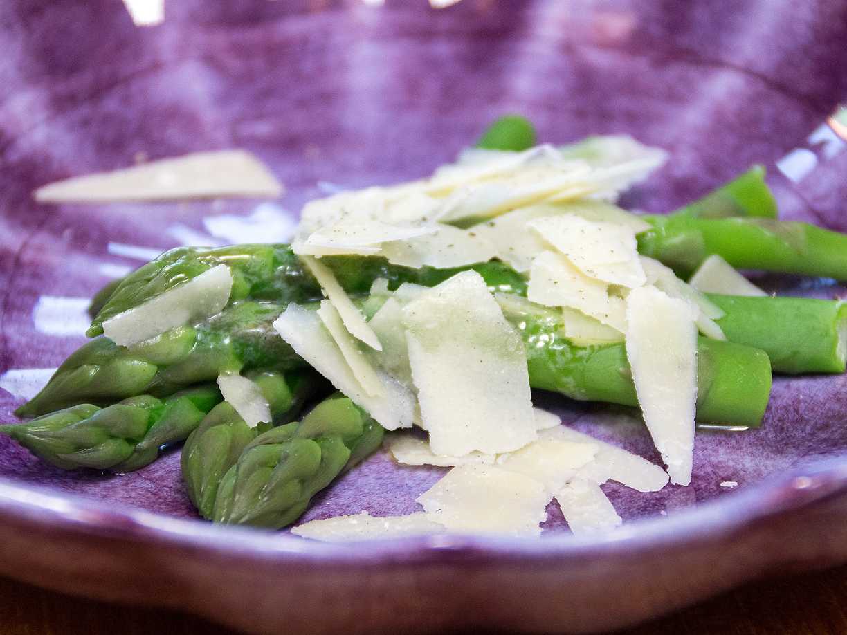 Grillad sparris med tomatdressing och hyvlad parmesan