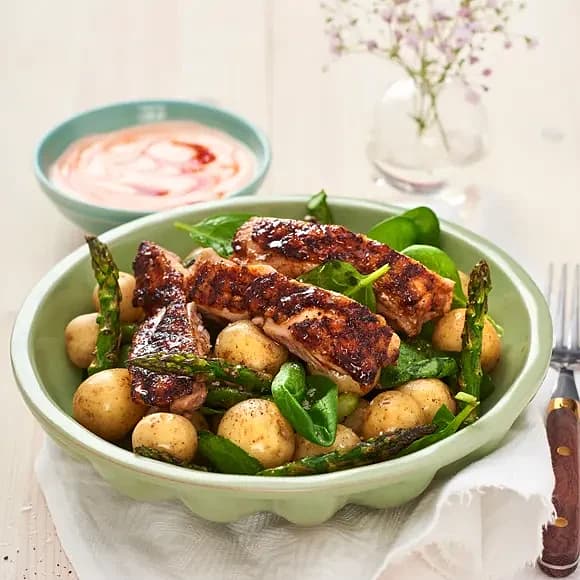 Kycklingsteak med srirachayoghurt och varm sparrissallad