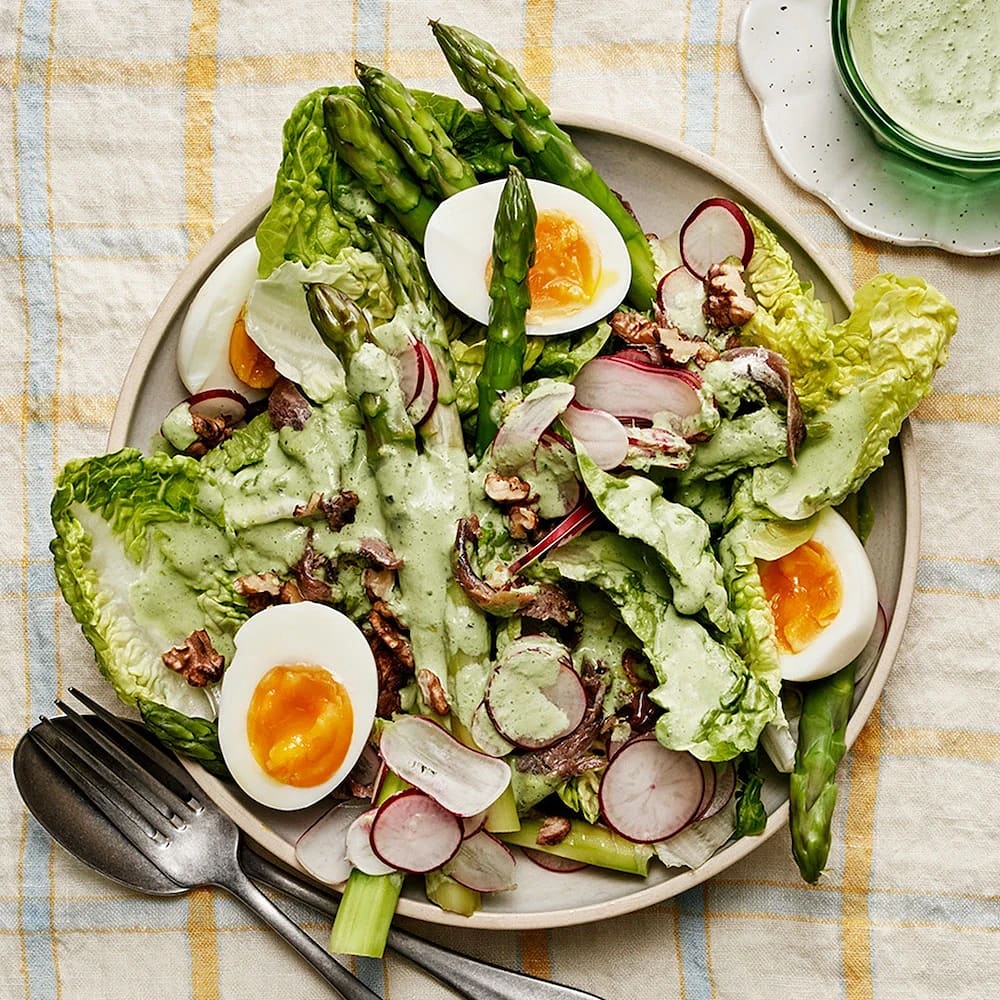 Sparrissallad med ägg och basilikadressing