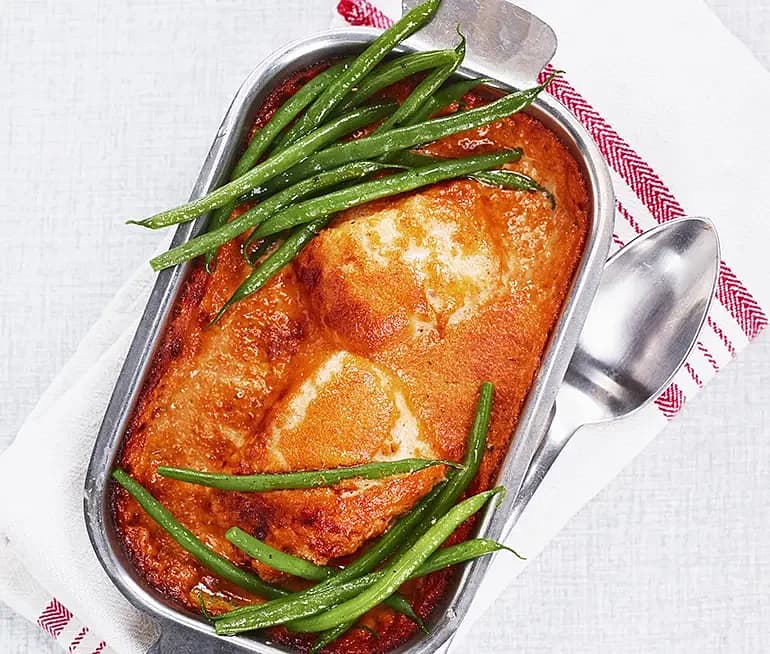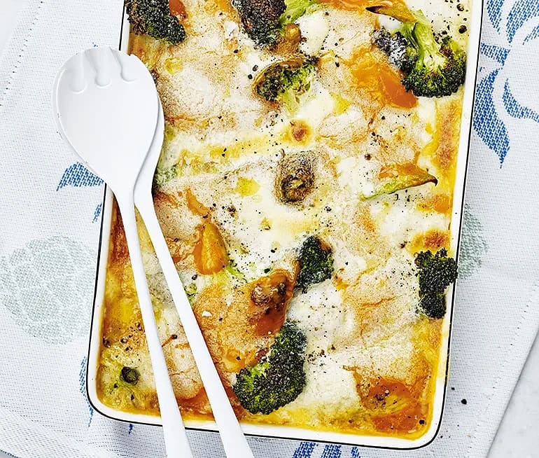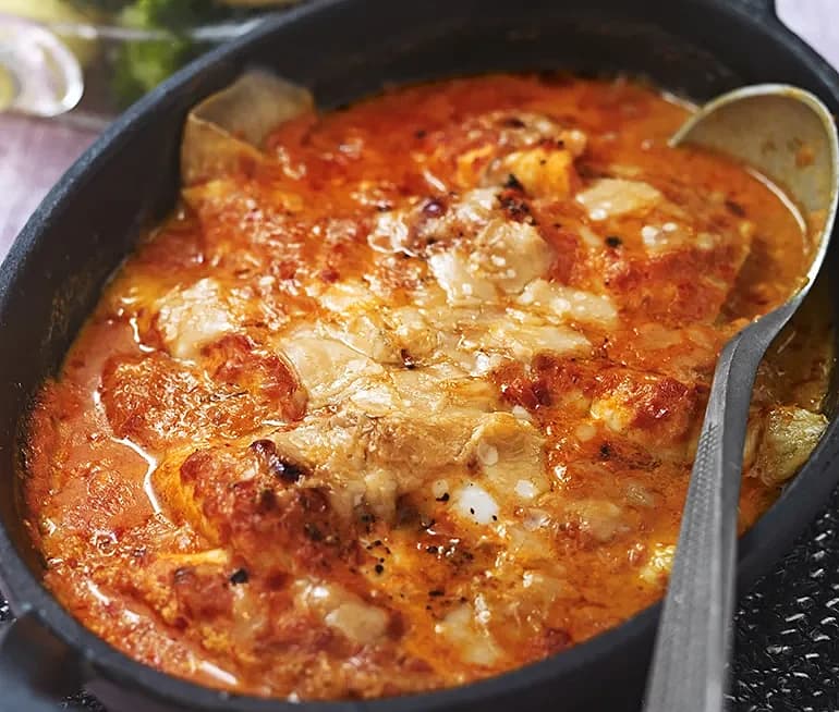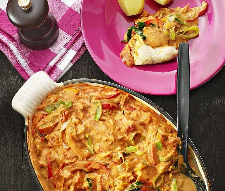 Ostgratinerad spätta med paprikasås