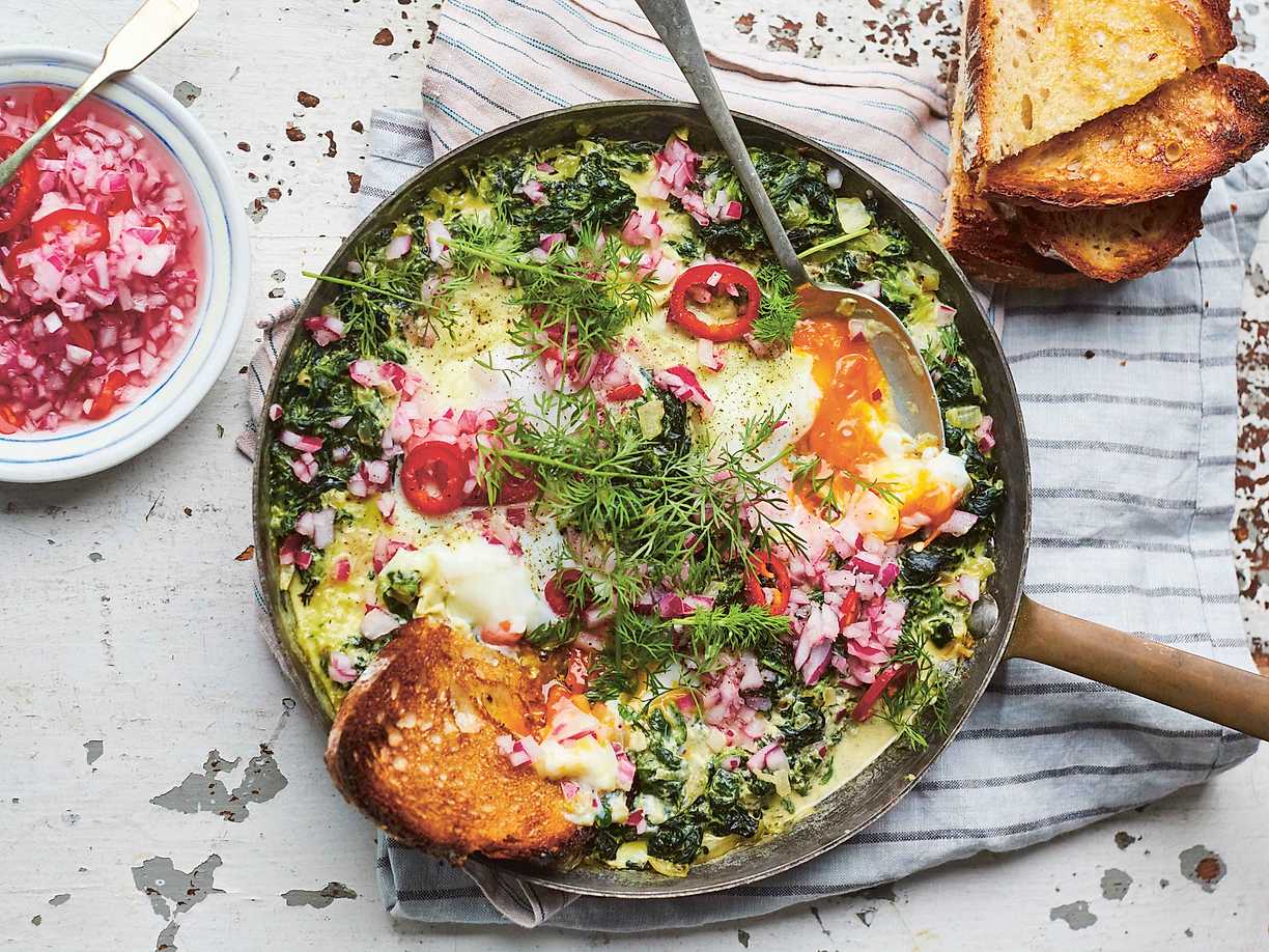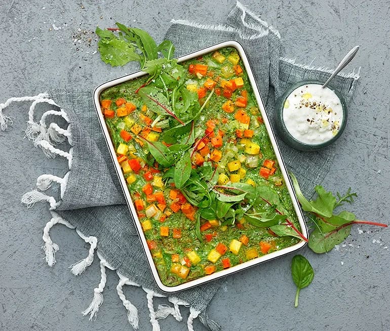 Spenat- och basilikafrittata med rotfruktspytt och fetaostkvarg