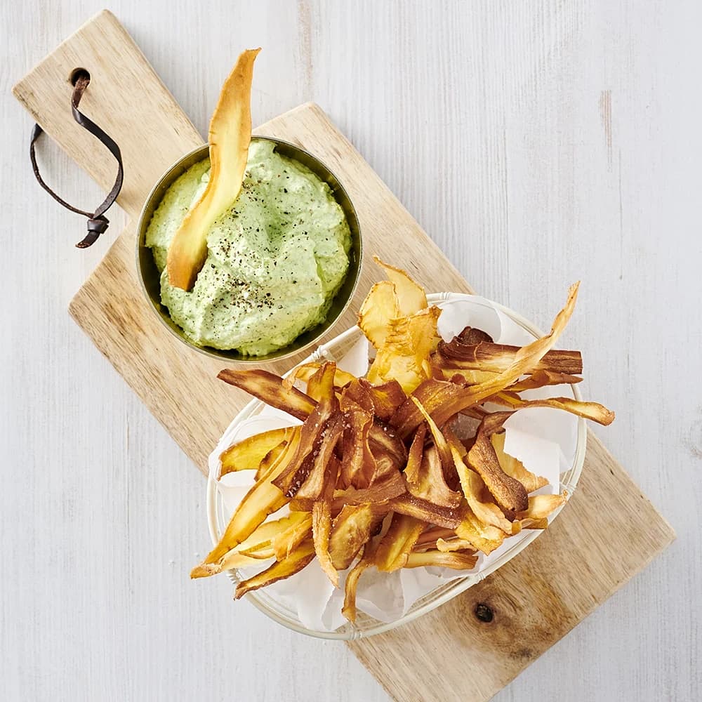 Palsternackschips med spenat- och parmesandip