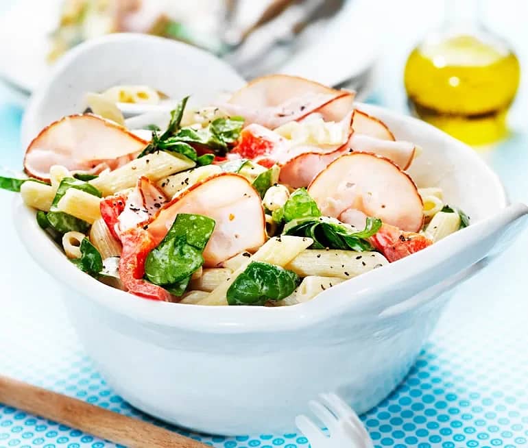 Pastasallad med tomater, ägg och spenat