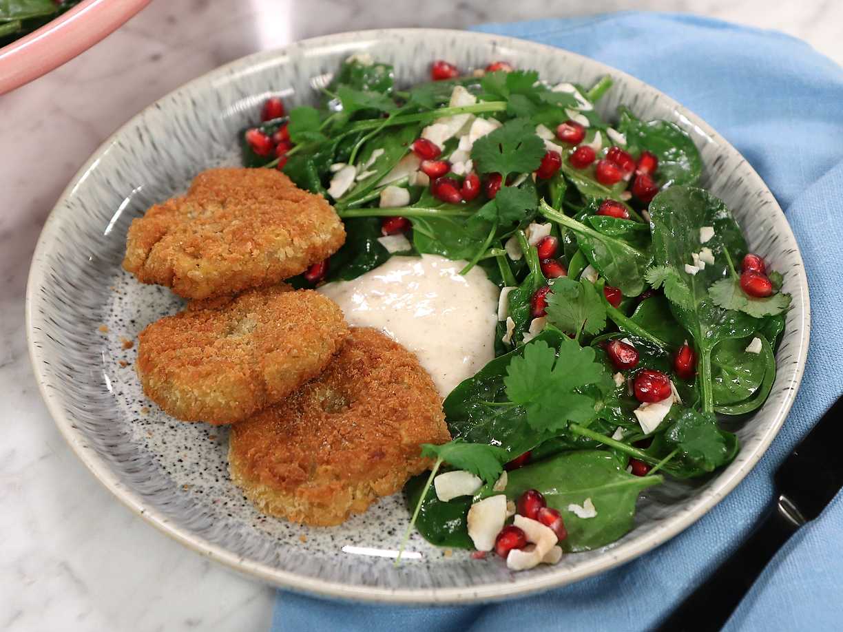 Kryddiga kikärtsbiffar med spenatsallad och mangosås