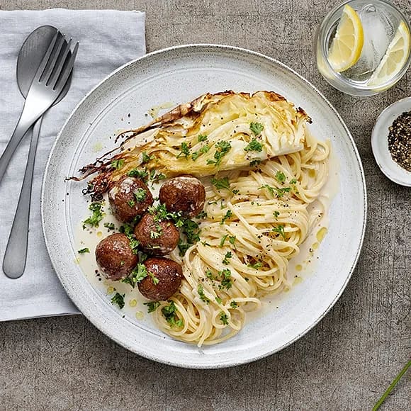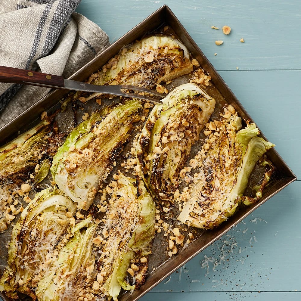 Vitlöksrostad spetskål med örtig smörsås och hasselnötter