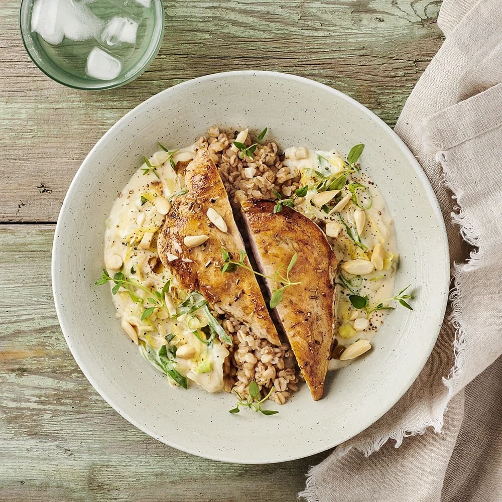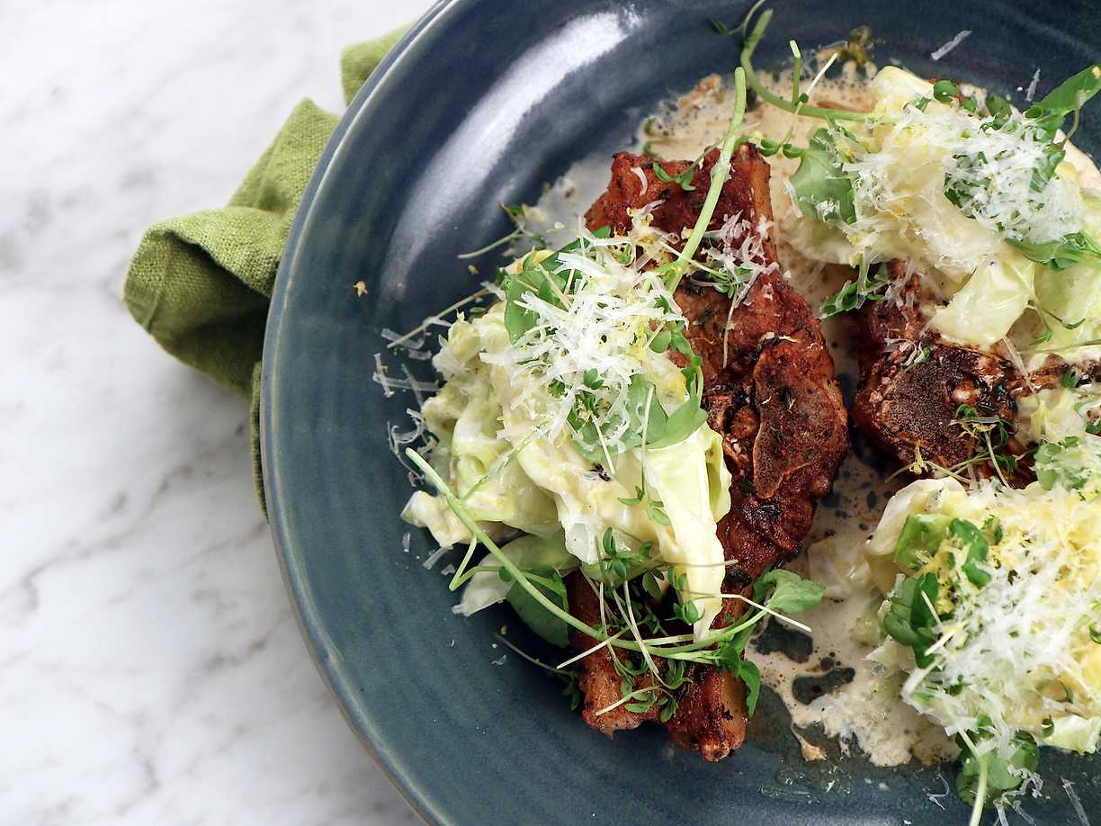 Smörbakad spetskål med krispig kyckling och gräddskum
