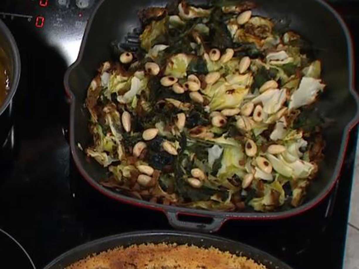 Bakad spetskål med svamp, hasselnötter och beurre blanc