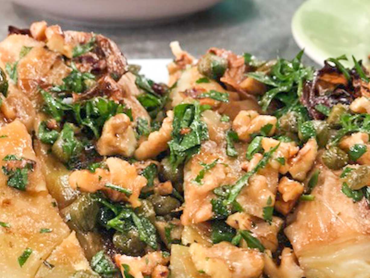 Bakad spetskål med kapris-vinegrette och rostade valnötter