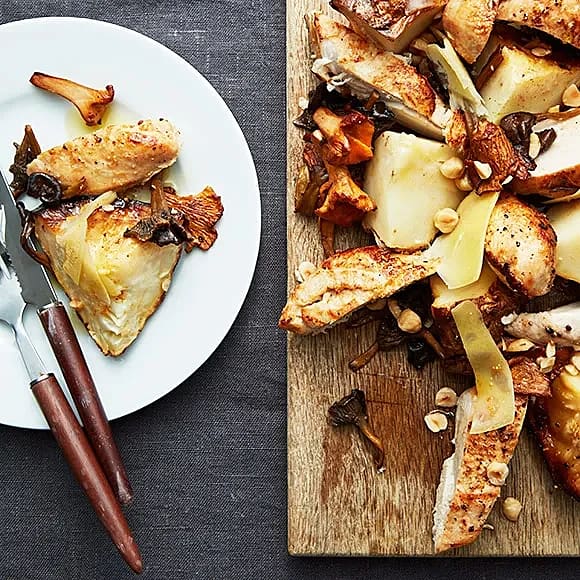 Stekt kyckling med lättstuvad rotselleri och saltrostade hasselnötter