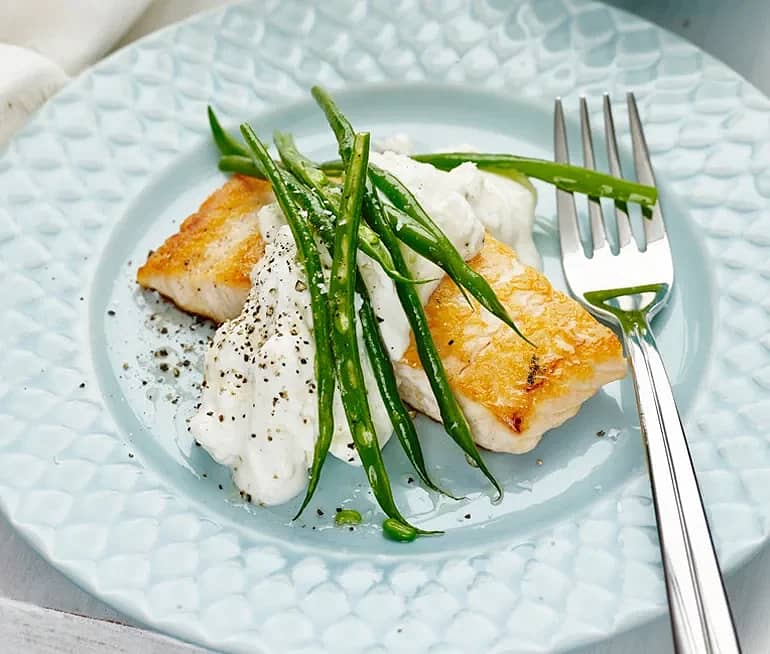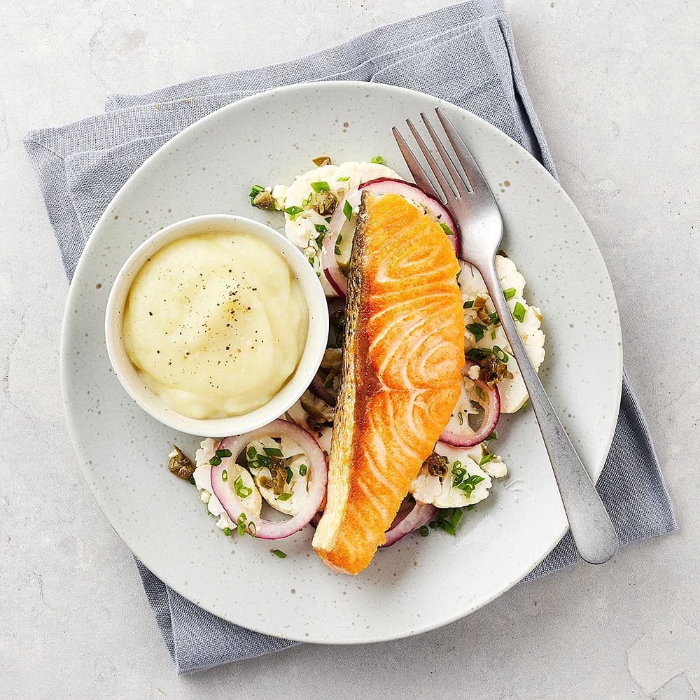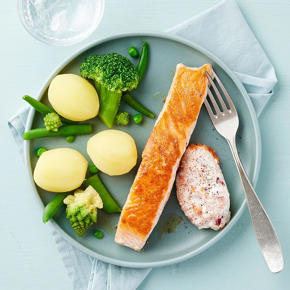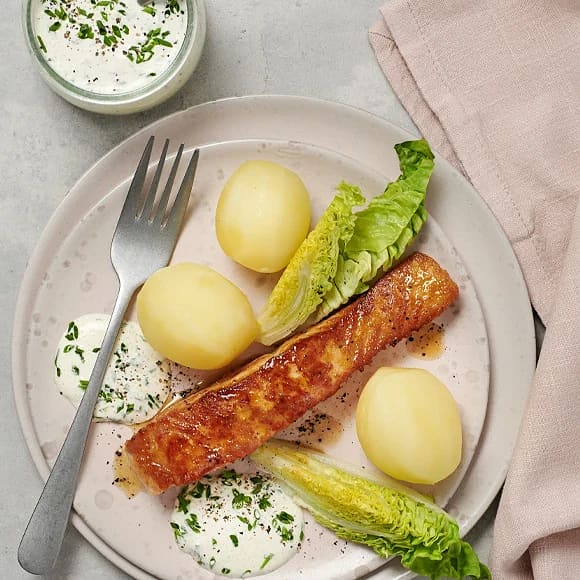 Stekt lax med pressad potatis, gräddfil, citron och örter