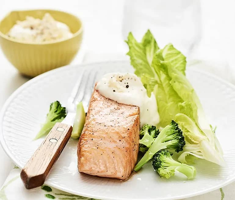 Stekt lax med rostad rotfruktsvete och fänkålsyoghurt