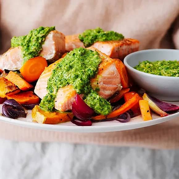 Rostade rotfrukter med stekt lax och ruccolapesto