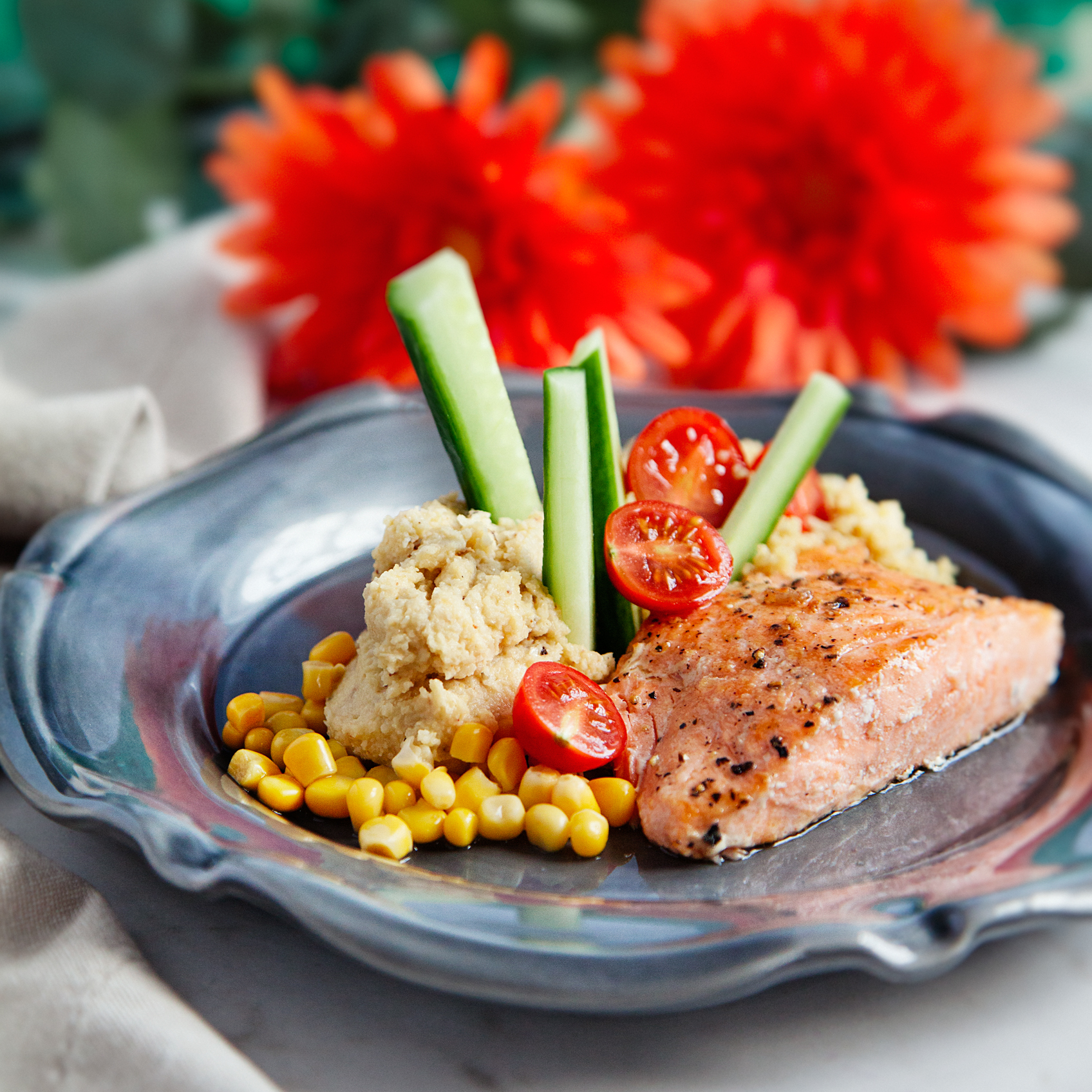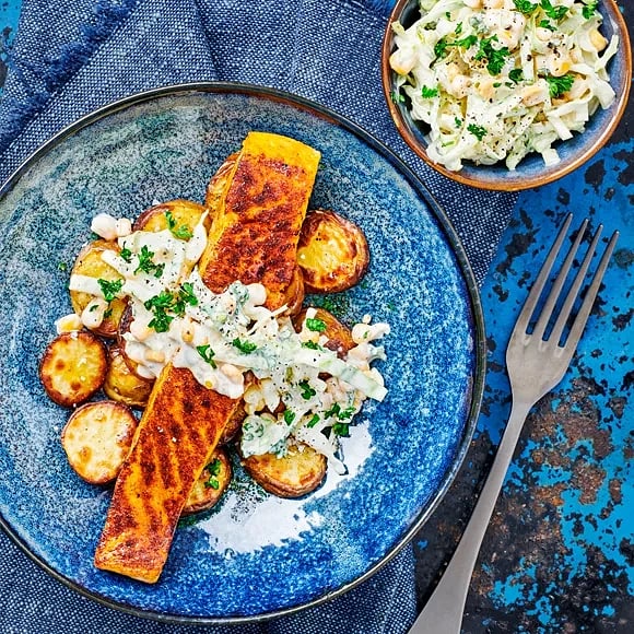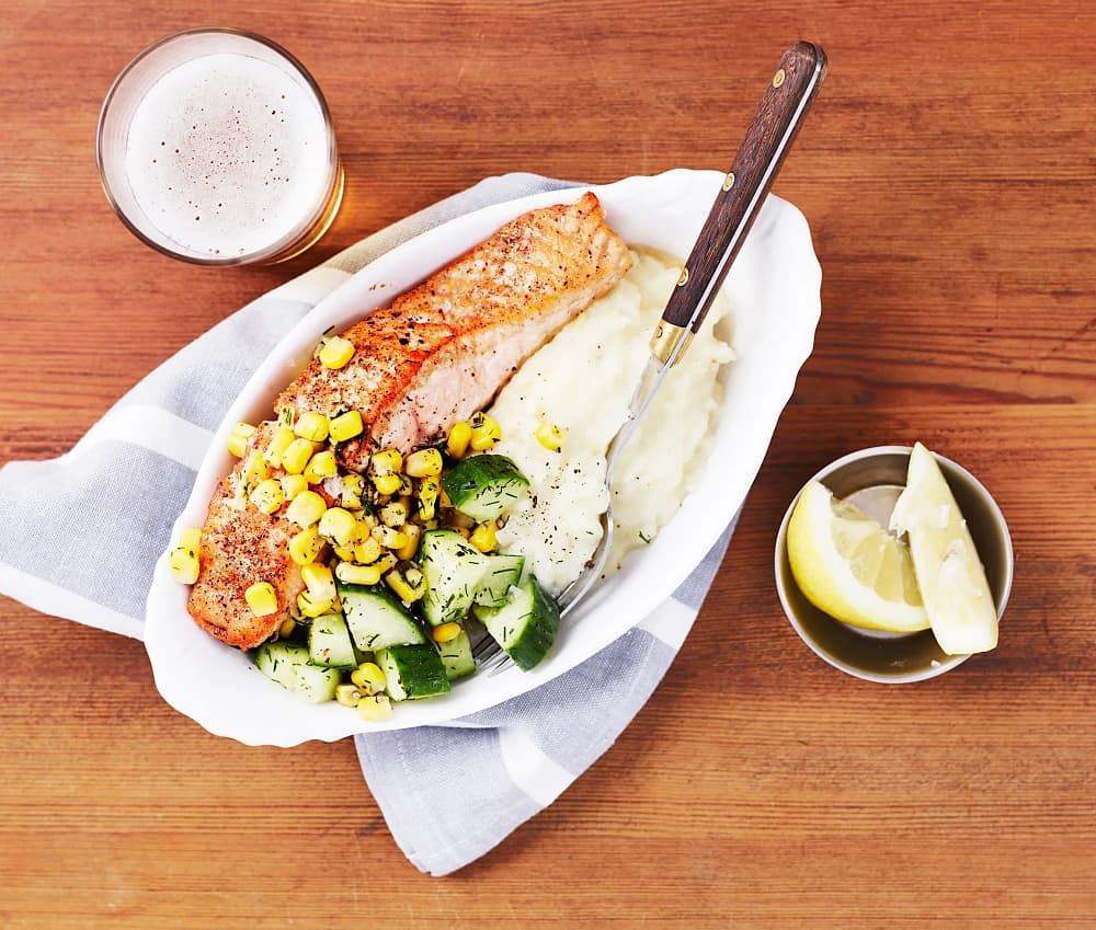 Stekt lax med het majs och zucchinisallad toppad med fetaost
