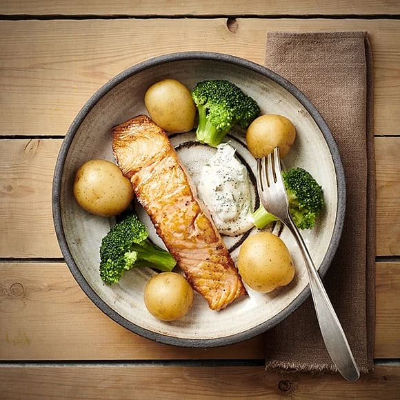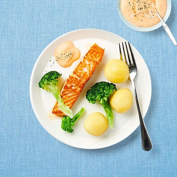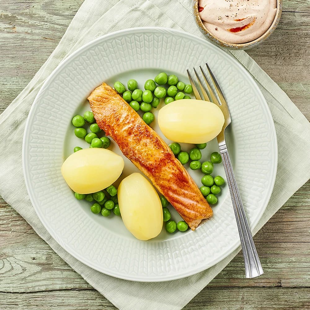 Stekt lax med dill- och pepparrotsslungad potatis och romsås