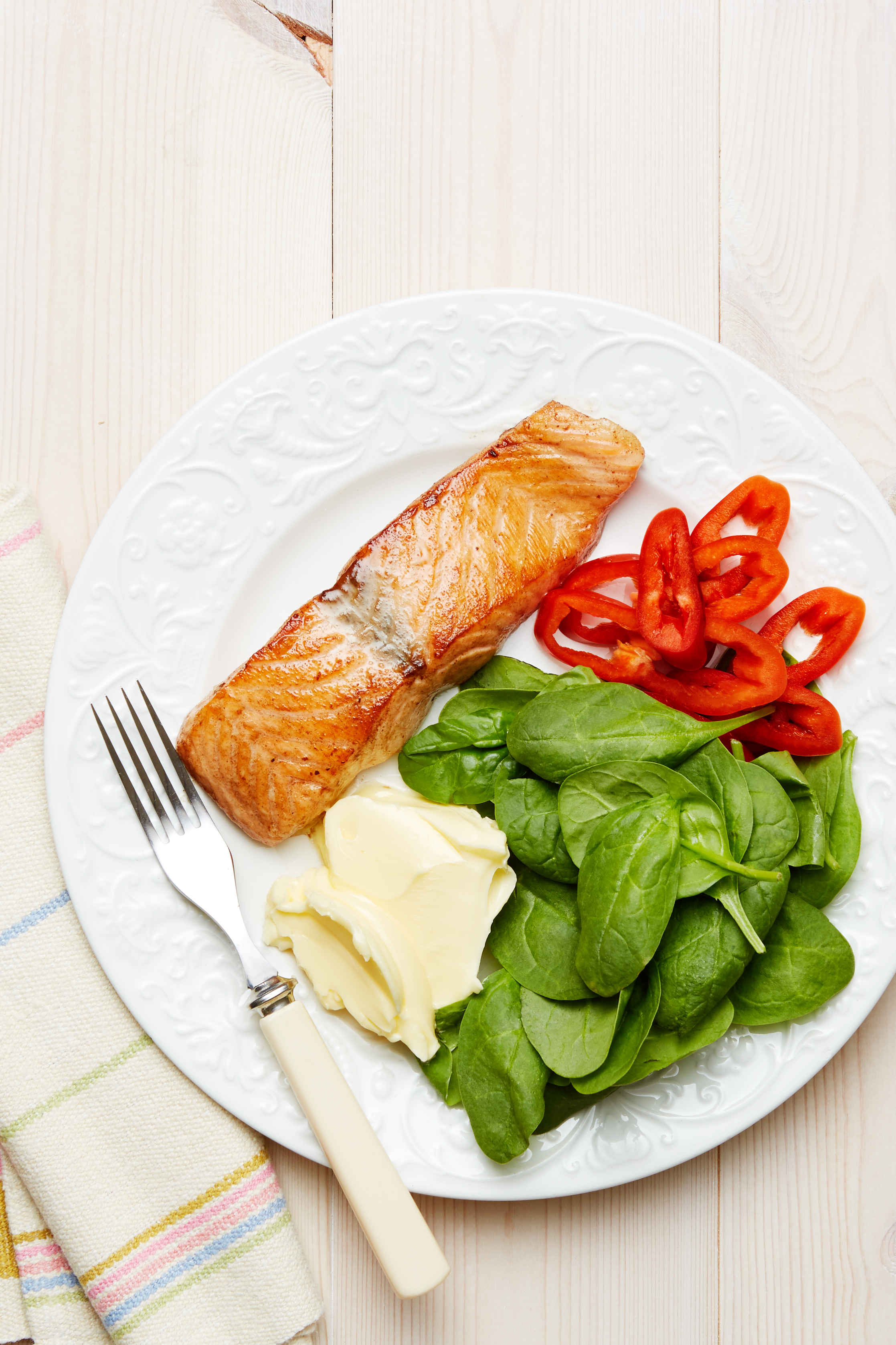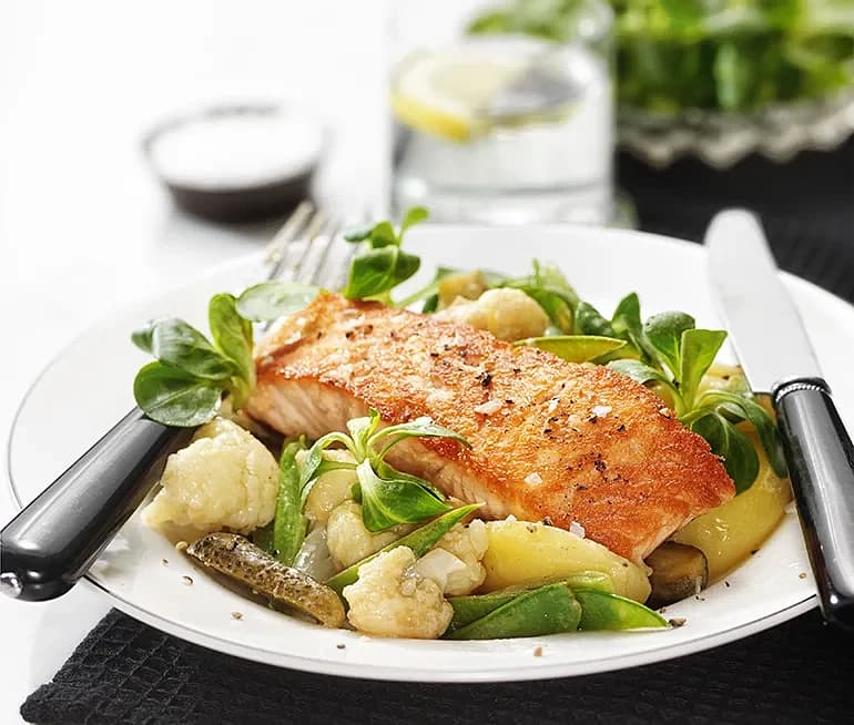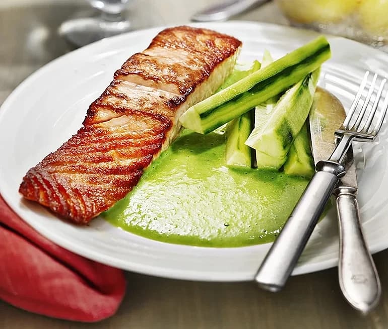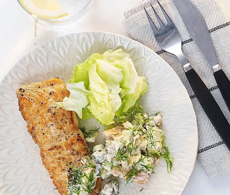 Stekt lax med dillstuvad potatis och spenat- och äppelsallad