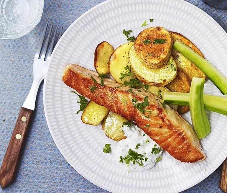Stekt lax med kryddig örtsås samt citron- och honungsslungad potatis