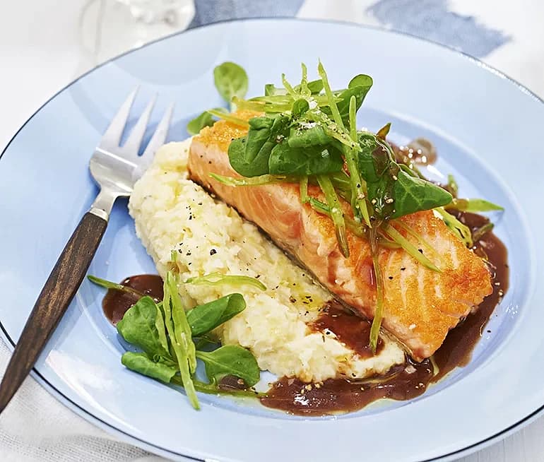 Stekt lax med palsternacksstomp och rödvinsås