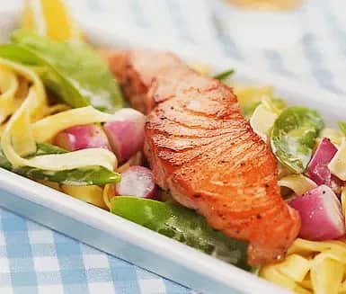Stekt lax med sensommarpasta
