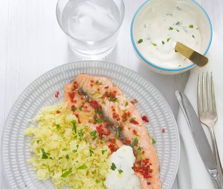 Blomkålstaboulle med stekt lax och romsås