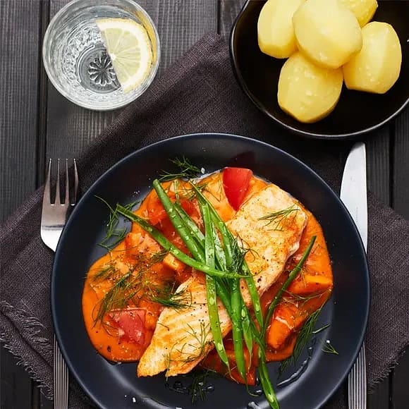 Stekt lax med tomatragu och haricots verts