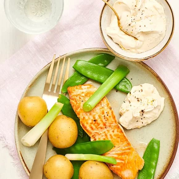 Stekt lax med citron- och ärtdipp