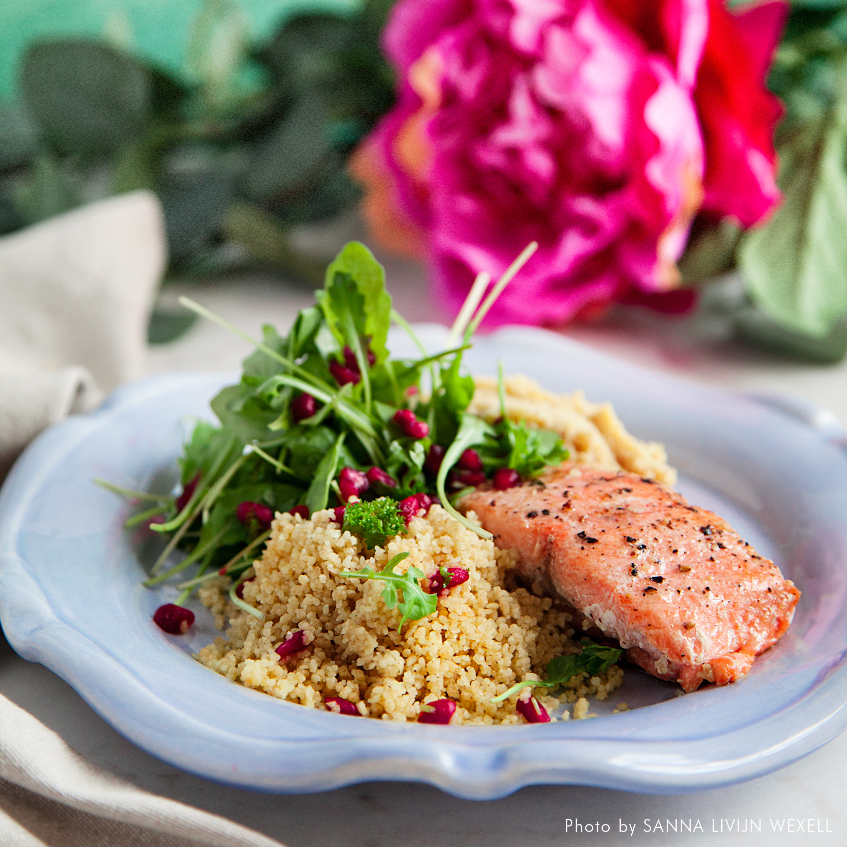 Stekt lax med granatäppelsallad och rostad blomkålshummus