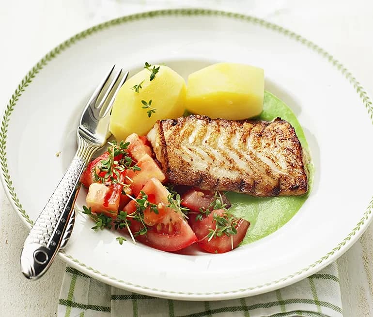 Stekt torsk med ärtsås och tomatsallad