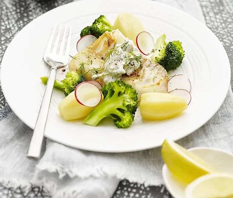 Stekt torsk med dillsås och broccoloco