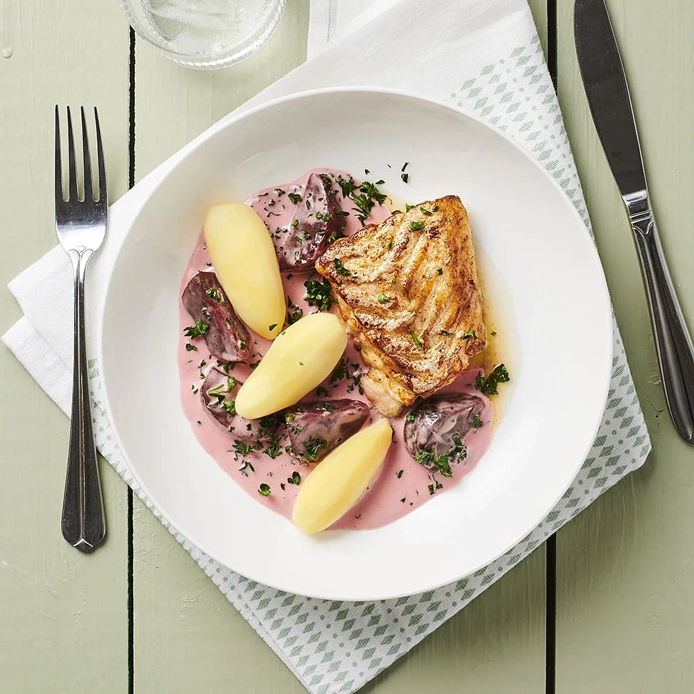 Stekt torsk med gräddkokta rödbetor