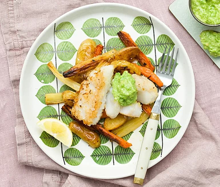 Stekt torsk med potatis och mosade ärtor