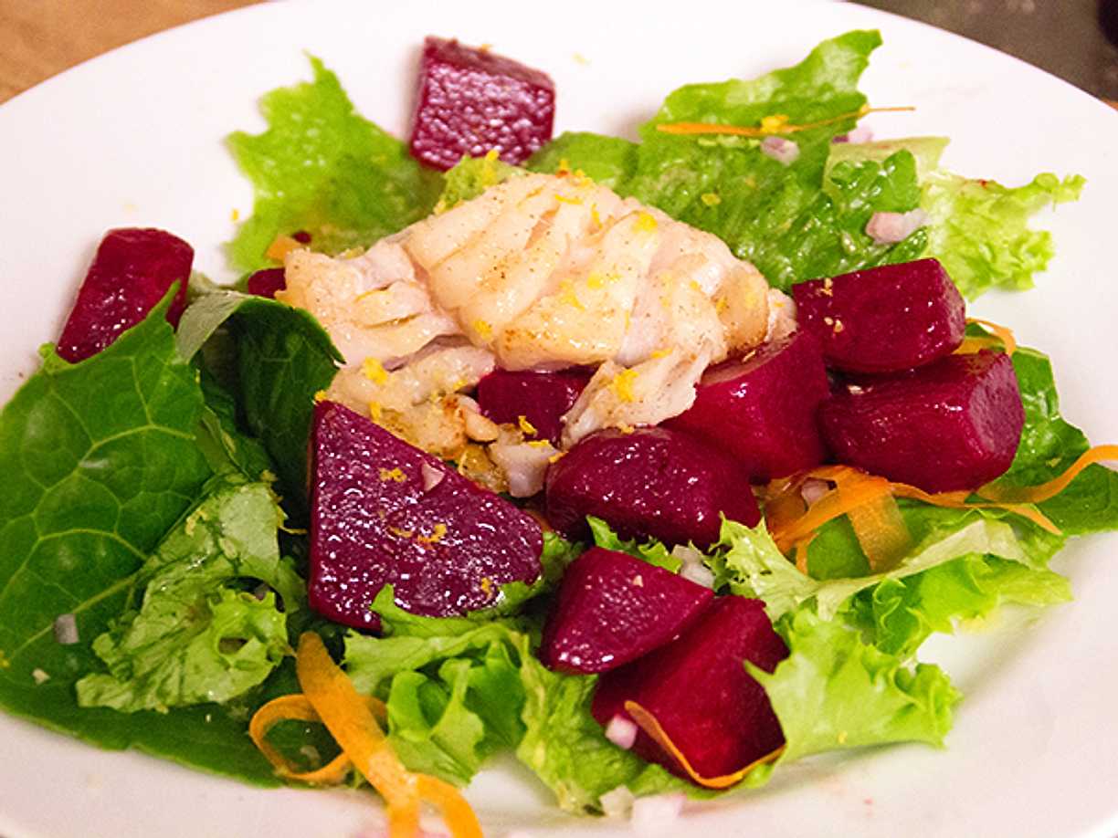 Stekt torsk och grönsallad med rödbetor