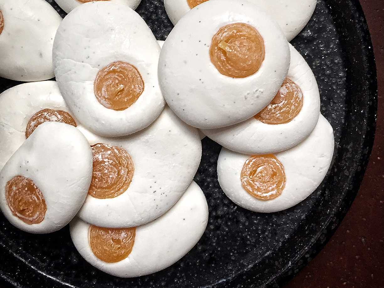 Stekta ägg - vaniljmarshmallows med mangogelé