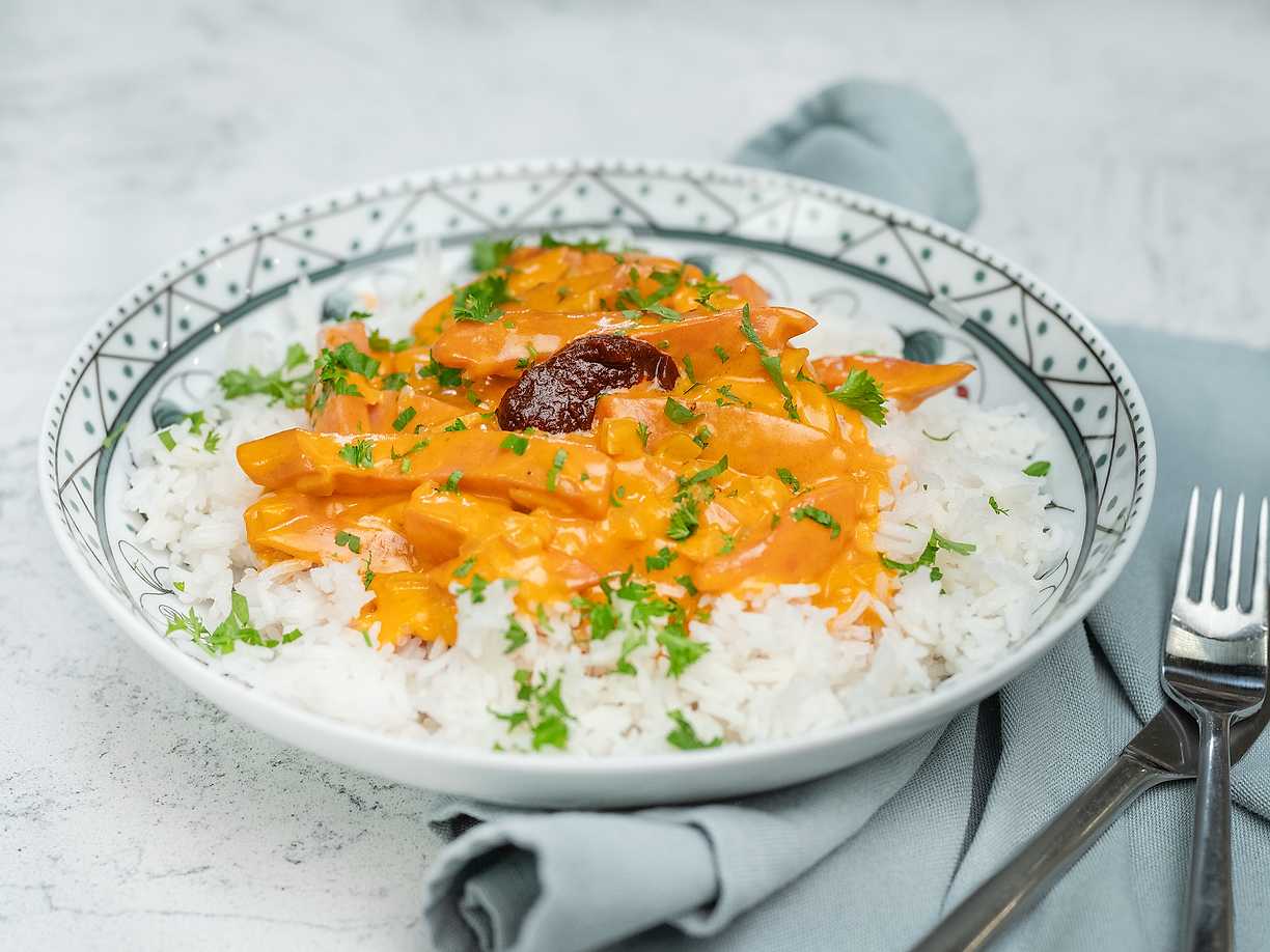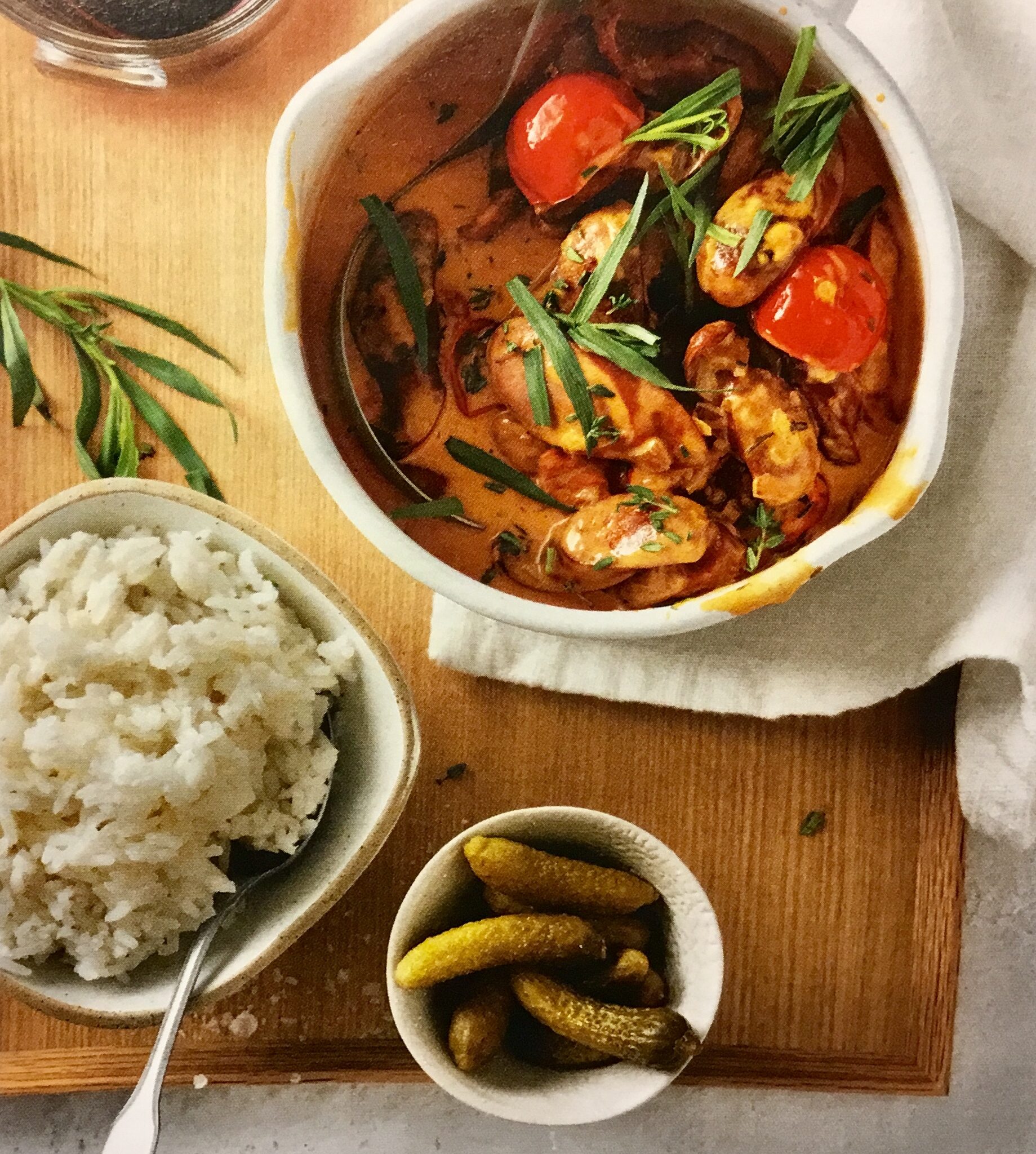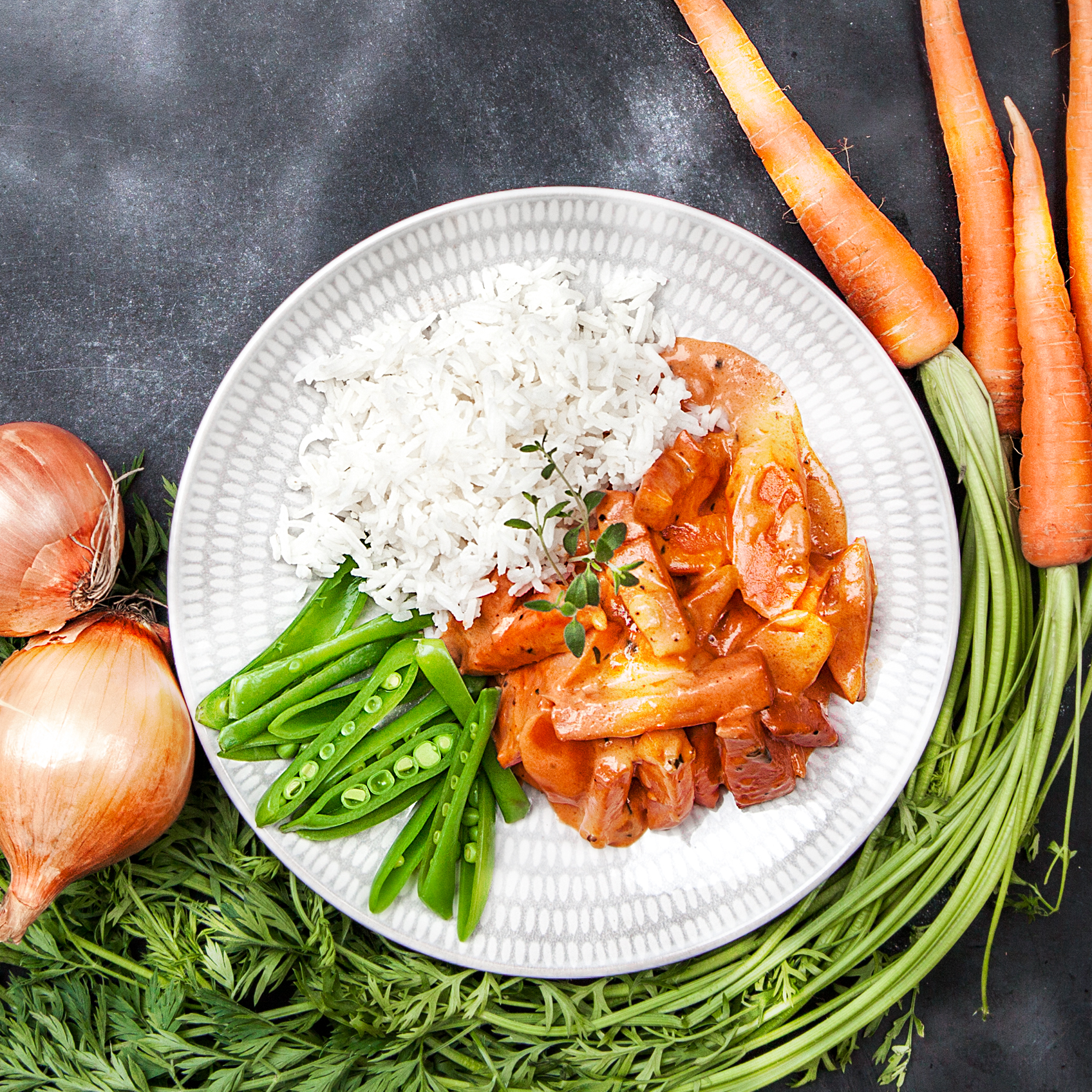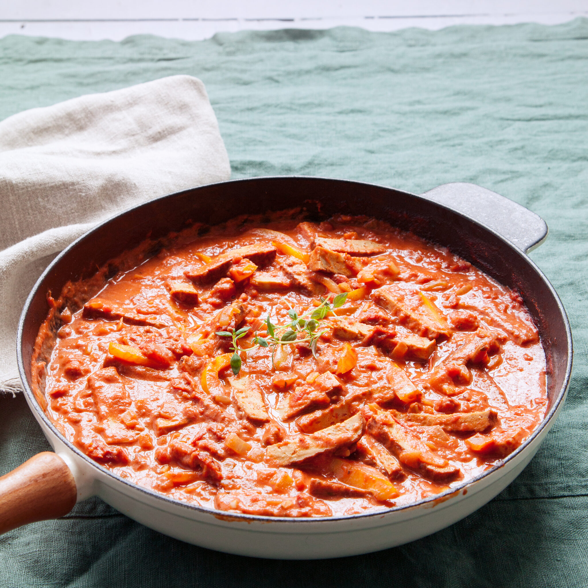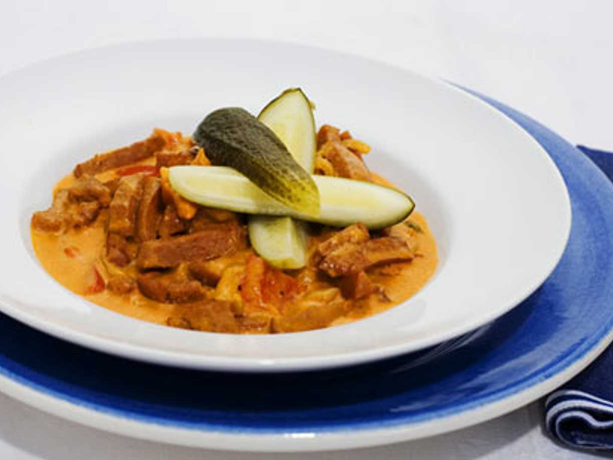 Korv Stroganoff med rökt fläsk, paprika och rosmarin
