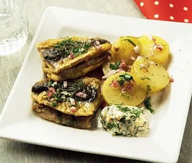 Senapsmarinerad stekt strömming med krossad potatis