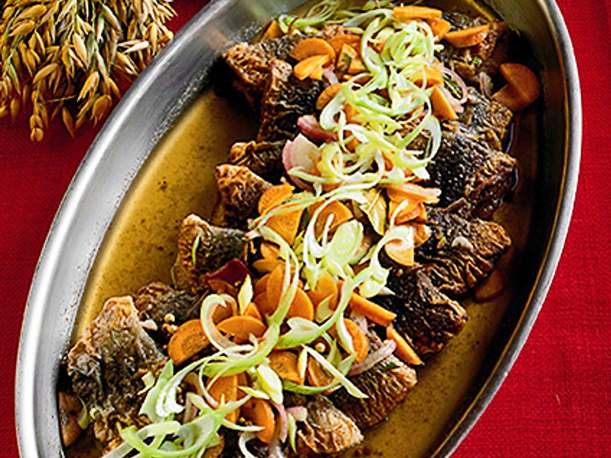 Rostad inlagd strömming med rötter och citronvinägrette