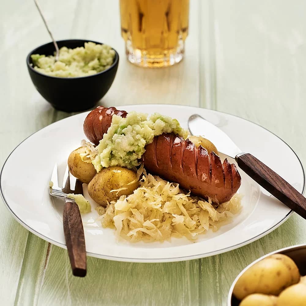 Bockwurst med surkål och äppelpepparrot