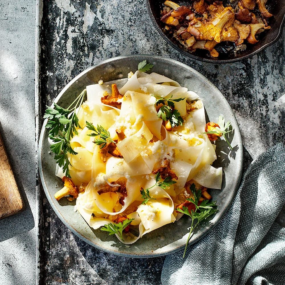Pasta på kålrot med kantareller och surkål
