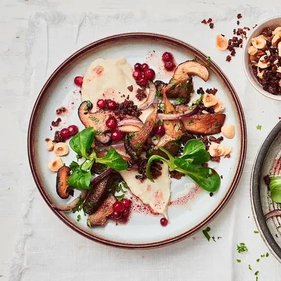 Svamp med jordärtsskocks- och sveciakräm, lingonvinägrett samt rågbrödskross