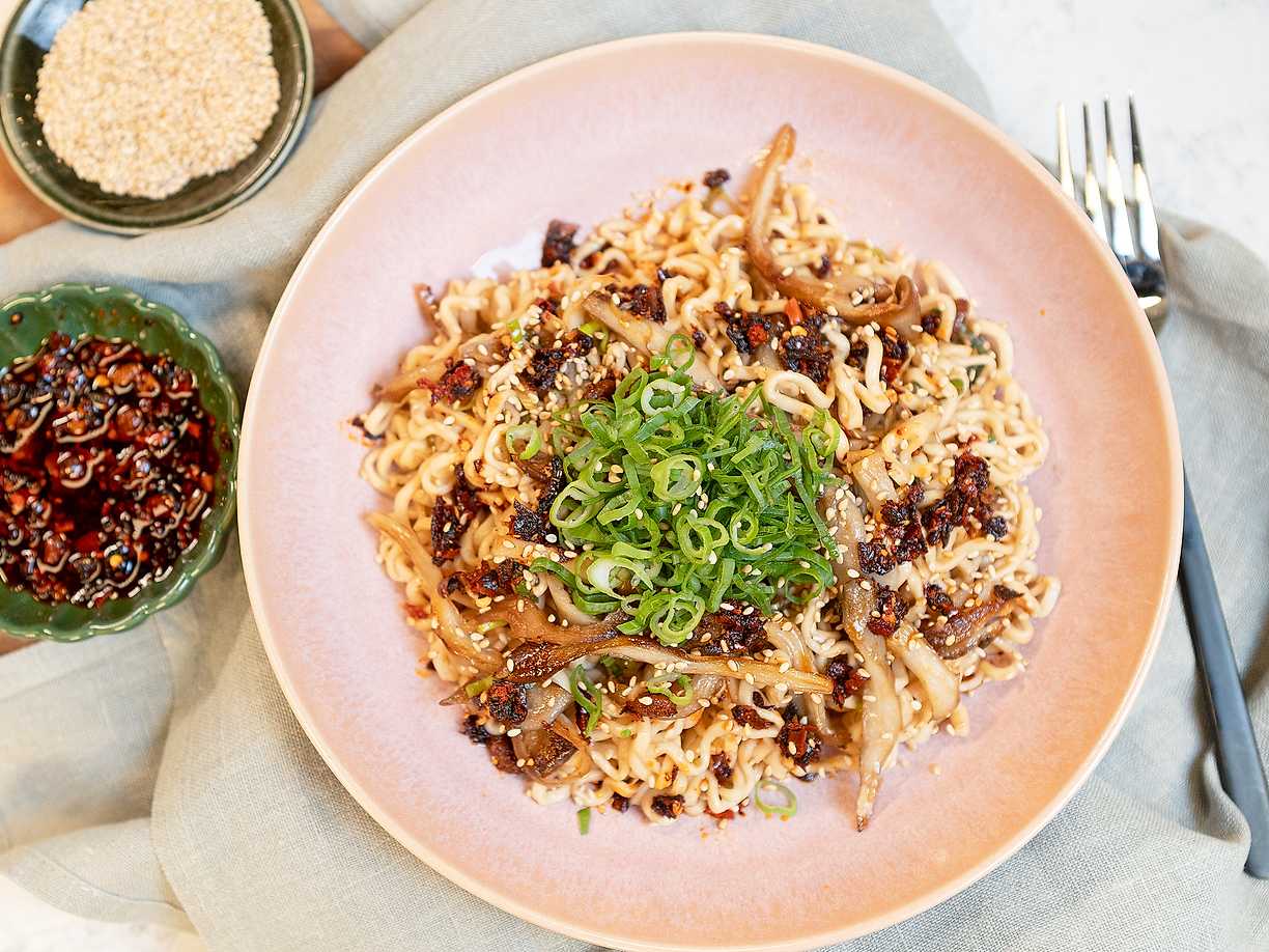 Snabba salladslöksnudlar med svamp