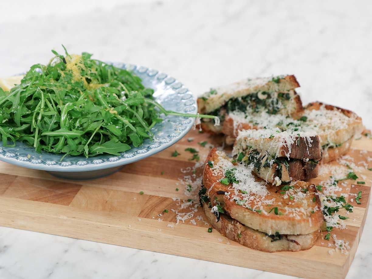 Surdegstoast med kikärtsröra, smörstekt svamp och lök