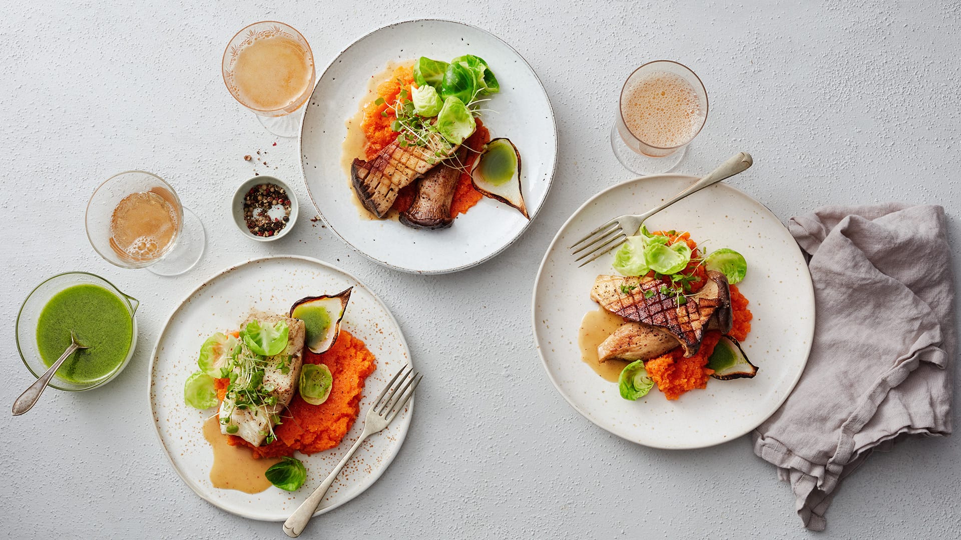 Helstekt rostas med timjan, vitlöksstekt svamp och potatis- och rotselleripuré