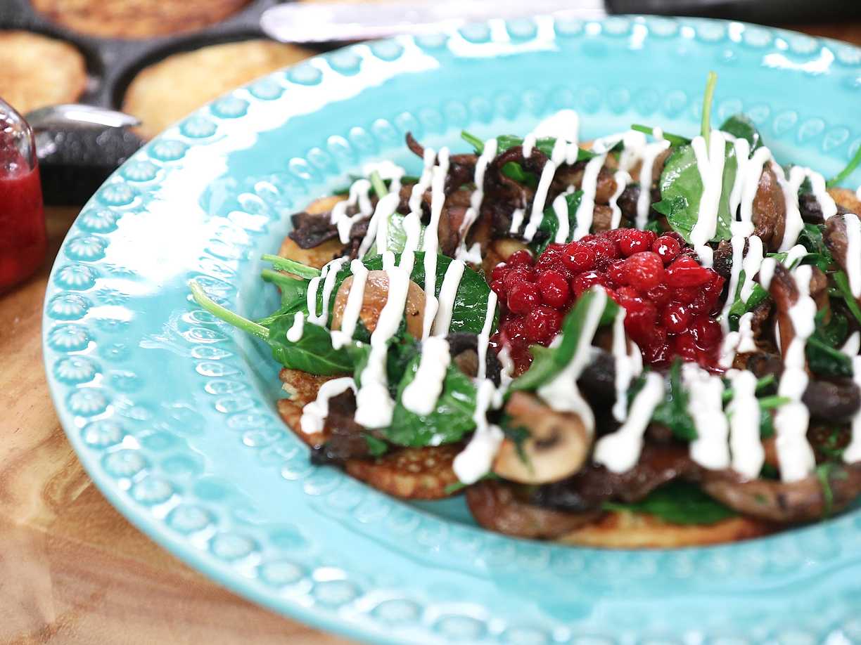 Potatisplättar med svamp, lingon och crème fraiche