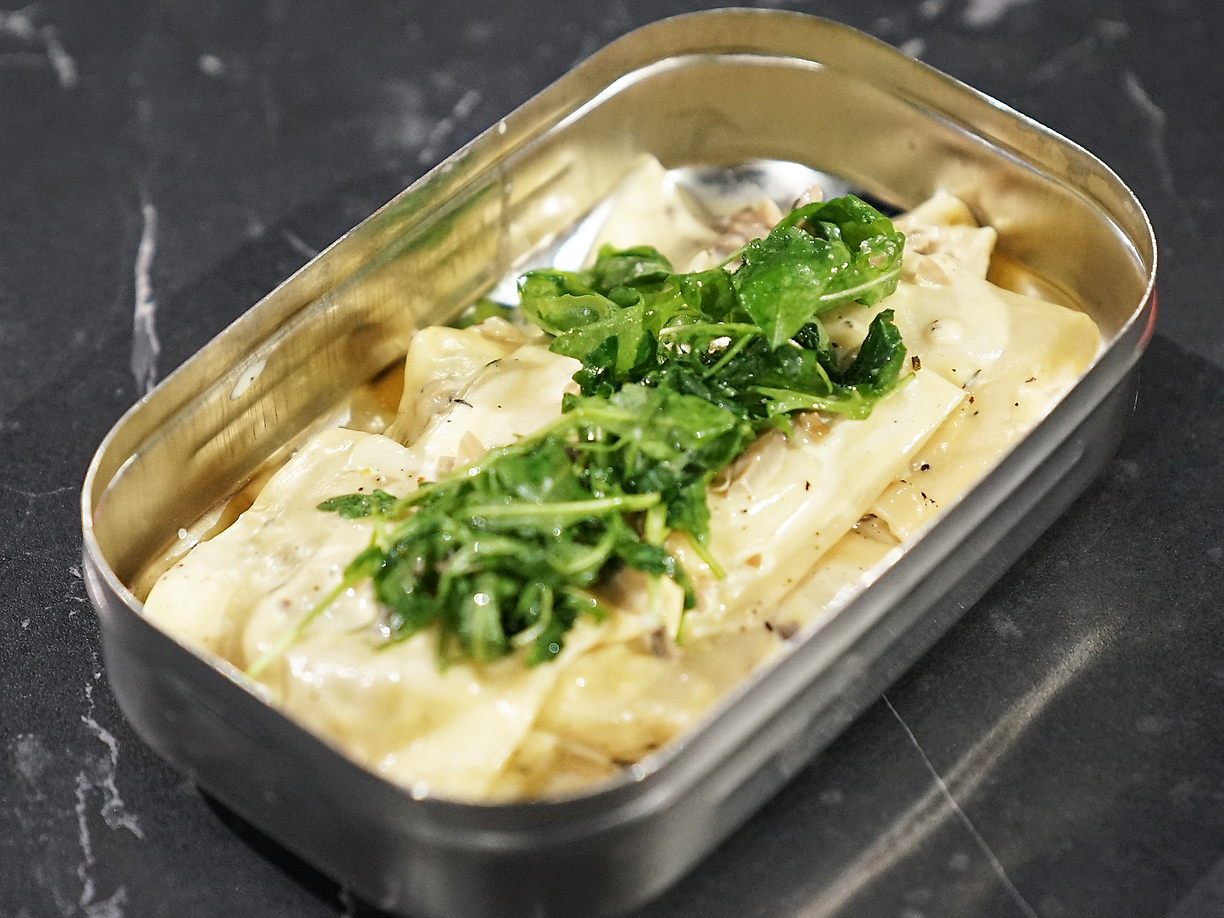 Svampravioli med krämig vitvinssås, rostade pinjenötter, ruccola och svart tryffel