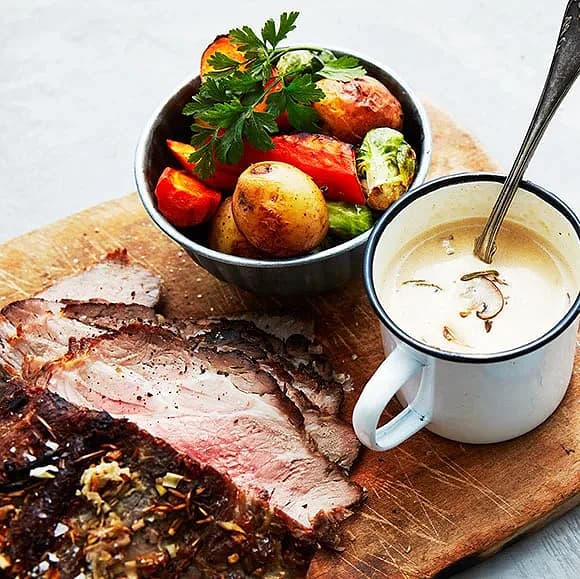 Ingefärsbakad fläskkarré med svampsås och rostade rotfrukter