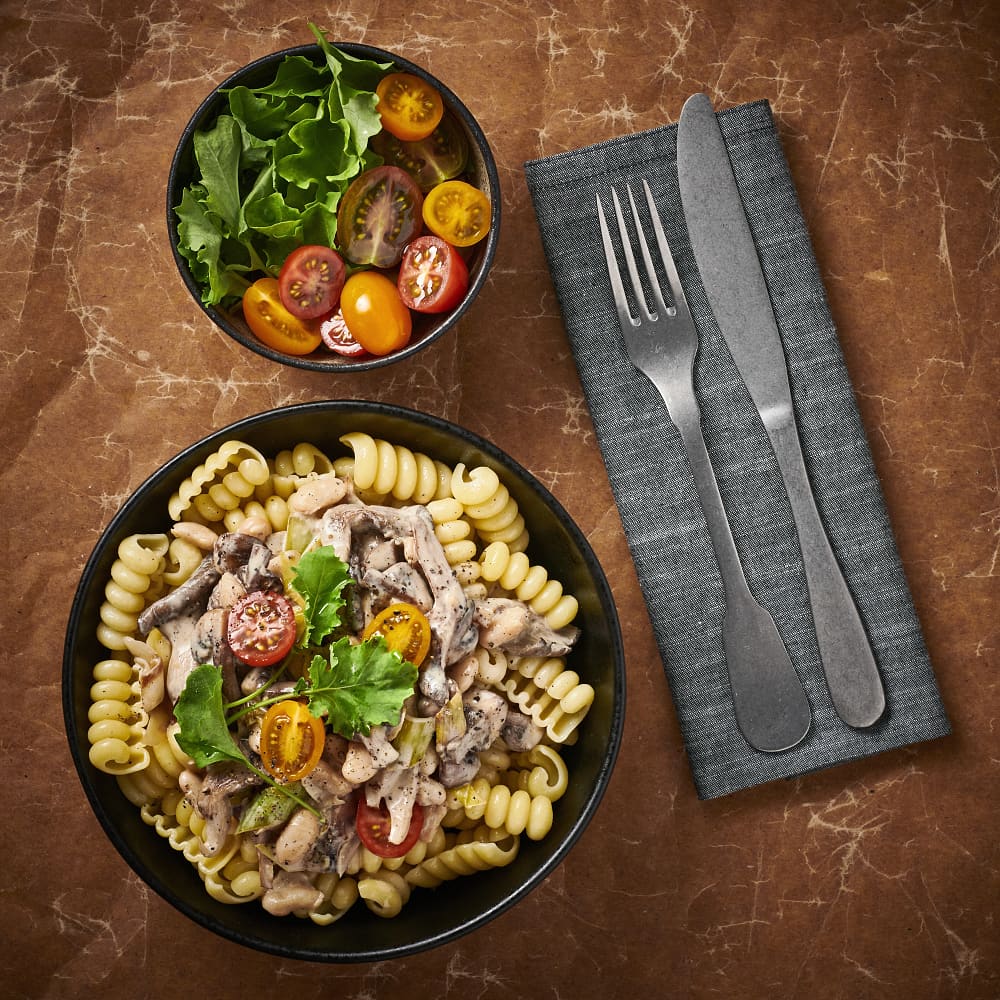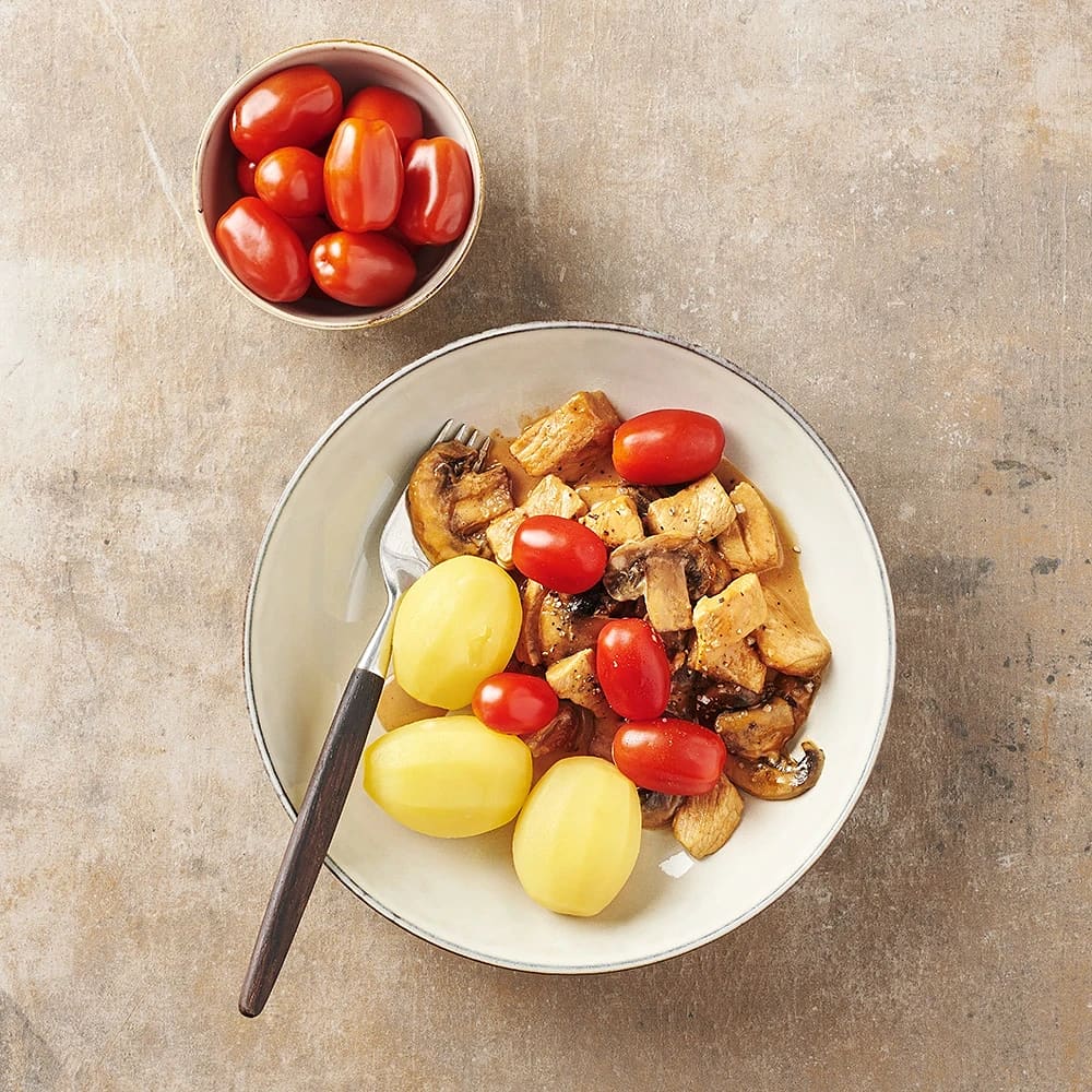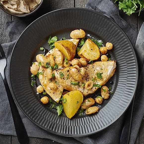 Marinerad kycklingfilé med svampsås och smördegsinbakad potatis